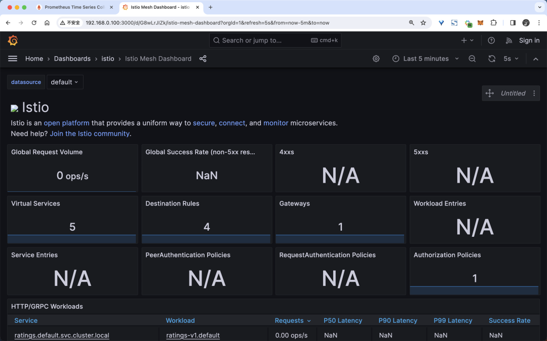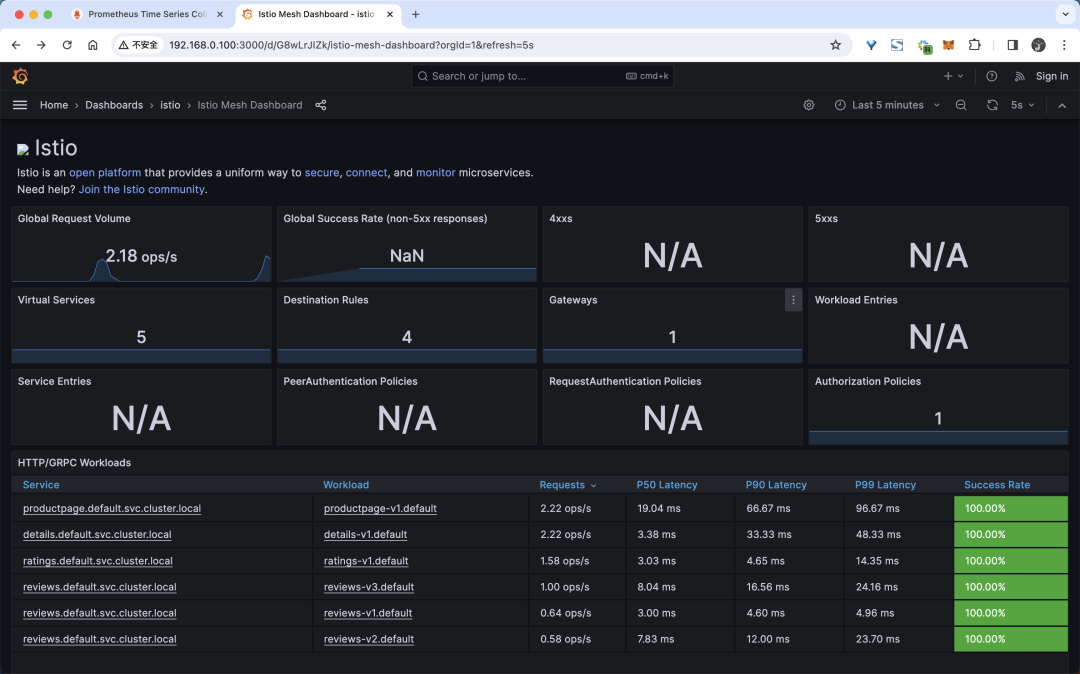 网格摘要视图:这部分提供网格的全局摘要视图,并显示网格中(HTTP/gRPC 和 TCP)的工作负载。单独的服务视图:这部分提供关于网格中每个单独的(HTTP/gRPC 和 TCP)服务的请求和响应指标。这部分也提供关于该服务的客户端和服务工作负载的指标。单独的工作负载视图:这部分提供关于网格中每个单独的(HTTP/gRPC 和 TCP)工作负载的请求和响应指标。这部分也提供关于该工作负载的入站工作负载和出站服务的指标。
