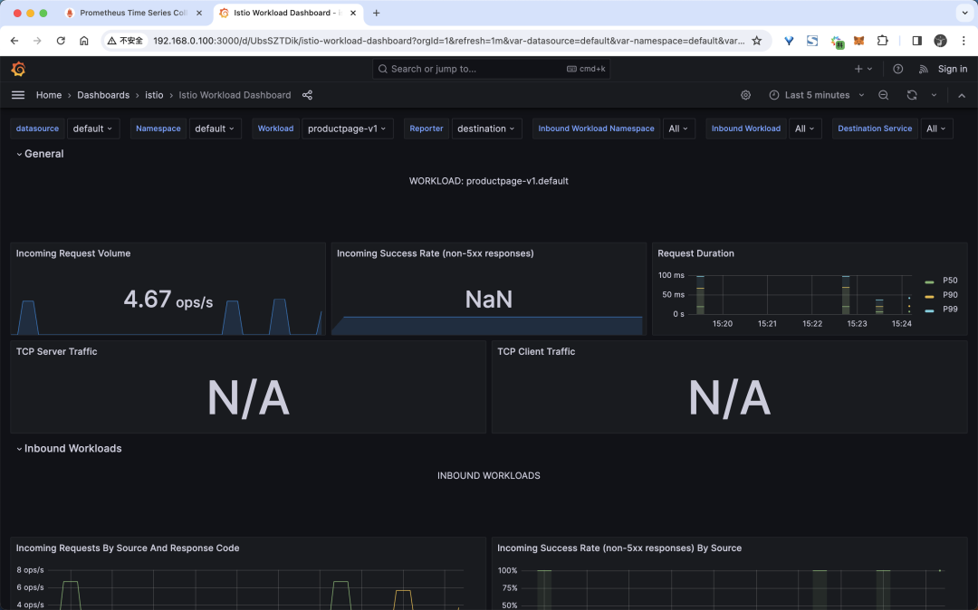 当然除此之外我们也可以查看到 Service 或者 Workload 的指标,比如我们可以查看productpage工作负载的指标: