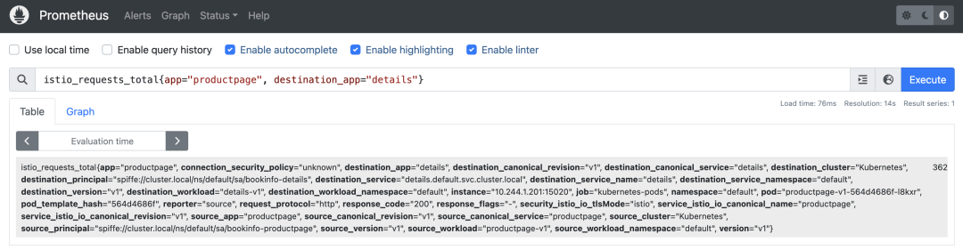 istio_requests_total{destination_service="productpage.default.svc.cluster.local"}1.