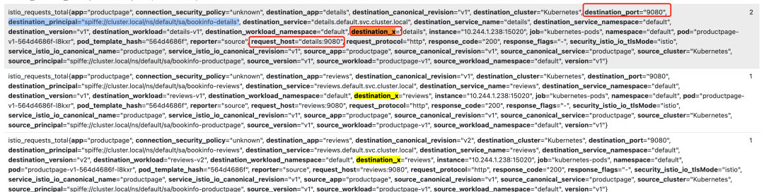 例如,用于出站配置中的对等应用标签的表达式是 upstream_peer.labels[app].value,所以上面我们最终添加的 destination_x 这个标签的值为上游对等方的 app 标签的值。