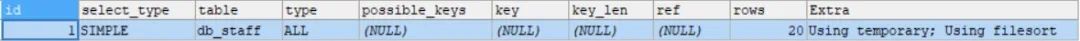 从执行计划可以看到,这条 sql 没有走索引,并且使用到了临时表(Using temporary)和排序(Using filesort)。