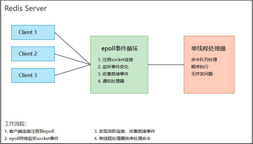 内核负责监听多个套接字Redis以单线程运行有请求时内核通知Redis处理(3) 效果:实现单线程高效处理多个并发连接