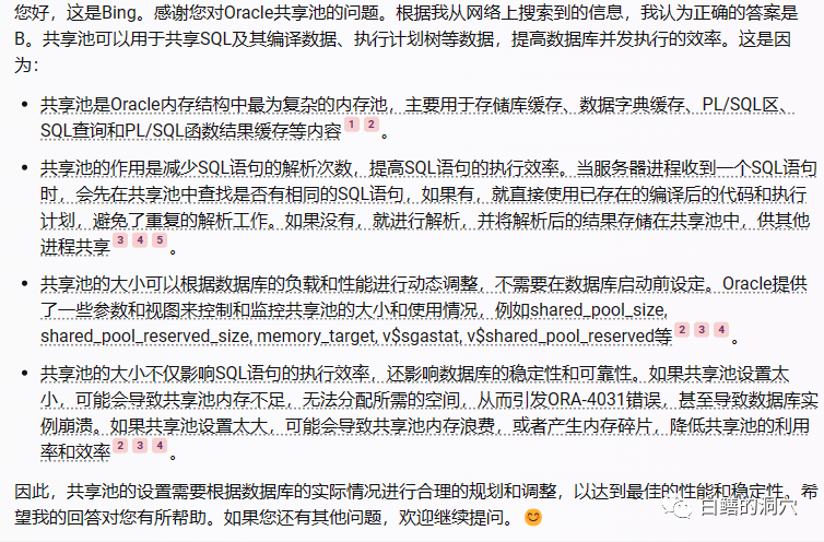 NewBing给出了一个十分完美的答案,不仅答对了,其分析过程也无懈可击。可能很多DBA干了五年十年,对Oracle共享池的理解也不过如此吧。