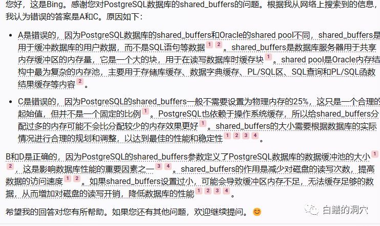 在一个新的会话中,我用了作为Postgresql专家这个提示,NewBing居然十分正确的回答了这个问题。从上面的测试可以看出,AIGC已经具备了很强的人类辅助能力,但是因为幻觉的存在,它的回答是不确定的,也是无法保证准确的。基于此AIGC在DBA领域的作用也最好被放在辅助上,而完全自动化驾驶的环境中,还是要慎用的。前阵子在Oracle PAB大会上,Oracle的一些技术专家对此的看法也是如此。AIGC支持下的MOS肯定会有,AIGC支持下的智能分析诊断也一定会有,AIGC支持的CBO优化器还不一定能有。