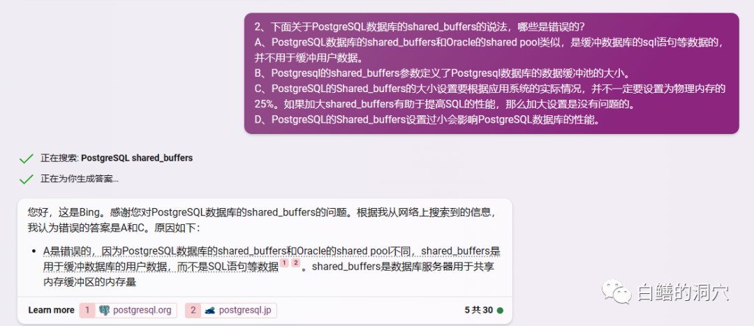 继续提问,不过这回出了一道更为复杂的题目,参杂了Oracle与PG的知识,这回NewBing显然没有给出正确的答案。