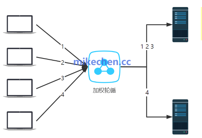 不考虑服务器当前负载;适用范围受限(对处理速度差异大的节点不友好);加权模式加权轮询算法在轮循的基础上,为每个后端服务器设置一个权重值(通过 weight 参数指定)。