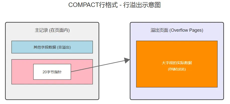 当数据过长时,它会把超出数据页容量的部分 “搬” 到额外的溢出页中存储;并在原数据页保留一个指向溢出页的指针(通常是20字节)。这就好比把装不下的书先放在旁边的临时箱子,再在原本的箱子贴上标签注明 “其余书在隔壁箱”。