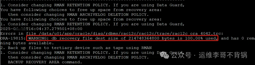 ORA-19815:FRA(Fast Recovery Area)已满;ORA-19809:无法创建新的归档日志;ORA-16038:当前 redo log 无法归档;ORA-03113:客户端与实例失联(其实是 Oracle 主动终止实例);这是一种典型的因 FRA 空间不足导致 redo 无法归档,最终实例崩溃 的场景。