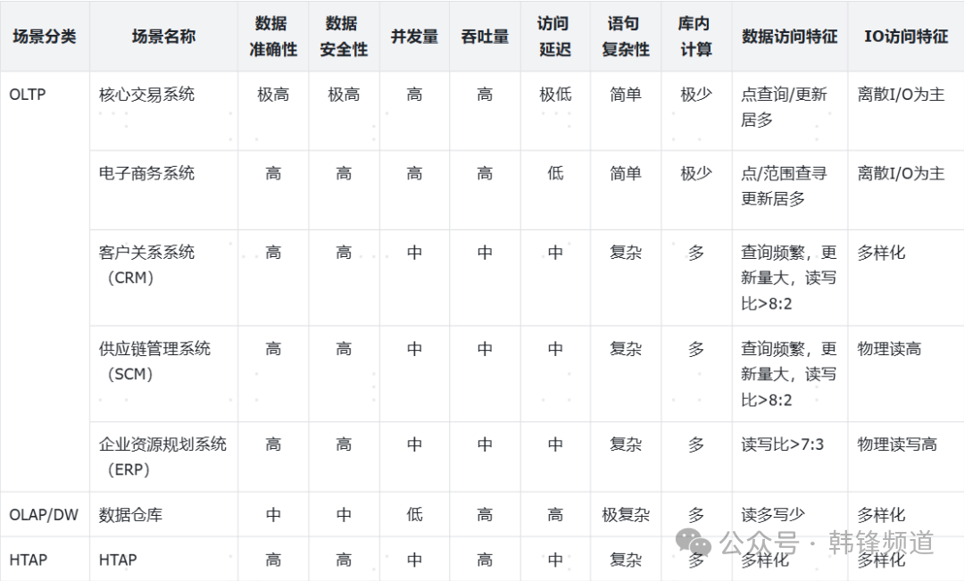 上面谈到了数据库主流用法,那么用户又该如何去选呢?一方面可以参考表格内容做好自有业务分析,一方面也可以参考行业一些通用做法。这里引用来自白鳝老师近期发表的一篇文章,其中对主流业务场景做了抽象。这里将下面场景逐一分析,看用什么架构适配会更为合适。