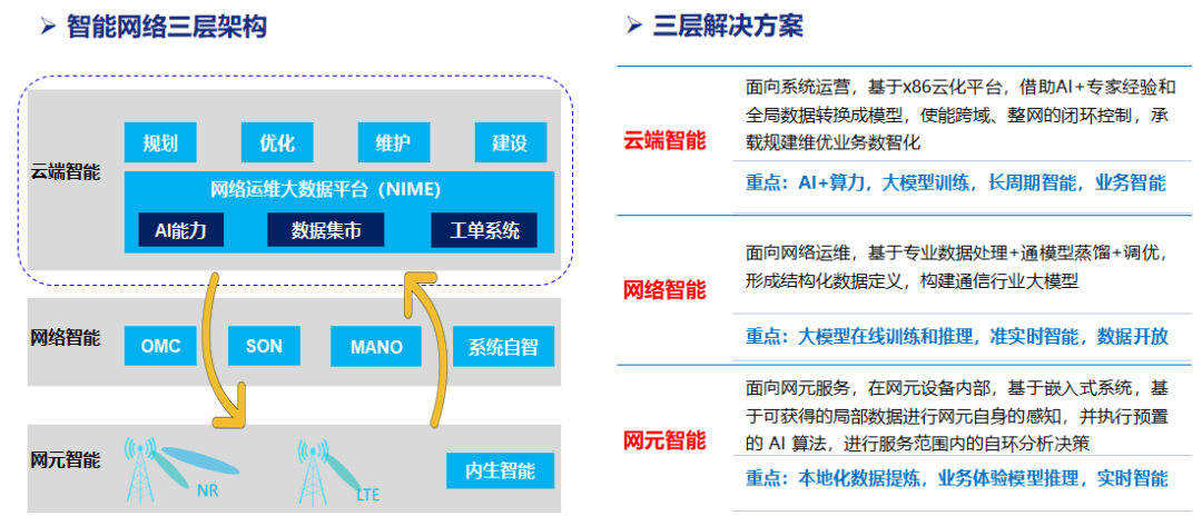 模型平台统一问题:从AI技术在通信的应用情况来看,面临场景多样和需求复杂的问题,任务多样,而不同的任务又有不同的数据需求;从模型应用来看,不同的任务很难定义统一的评价目标,导致不同的场景需求需要不同的AI模型,出现“大炼模型”的行业现状。而大模型技术,能够处理自然语言处理的多种任务,同样的,我们希望,大模型技术也能应用于智能运维的多种任务,构建统一的模型平台。数据集的多来源问题:从数据集方面,通信行业虽然拥有大量网络数据,但是数据来源和数据形式多种多样,从之前的AI应用来看,数据的清洗、筛选等处理是一个极其耗费人力的工作。而大模型技术在预训练过程使用了多种不同来源的数据集,具备处理多模态数据的能力,对数据的式样和分布兼容性较高,可以通过微调等技术便利的应对数据的多来源问题。功能迁移能力:大模型技术具有强大的知识抽取能力,而智能运维的大量任务可以归类为知识抽取任务,比如告警的根因分析、干扰识别等任务;大模型技术在自然语言处理中有大量的序列转导任务,比如翻译任务,而对于无线网络基于用户体验和网络环境的网络优化来说,存在用户感知与网络KPI的映射、网络KPI与设备状态的关联等需求,这些需求都可以类似于序列转导任务来进行解决。模型的增量学习和进化:机器学习模型假设数据分布是平稳的,即训练时接受同分布的数据训练。但是无线网络随着业务种类和用户流量的持续增加,网络的状态也在不断发生变化,需要模型能够持续的增量学习,而大模型技术的自我学习和进化能力非常适用于网络的持续优化要求。对于构建电信行业大模型,需要利用行业数据对大模型继续微调或重新训练,以提升模型的专业性。从行业数据角度,通信行业基于标准化的体系架构,是一个高度标准化、数字化的专业领域,已经积累大量的历史数据,经过场景业务梳理和对数据的处理,可以转化为大规模、多样性、高质量的有效训练数据集,在行业数据方面具有构建行业大模型的必要条件。
