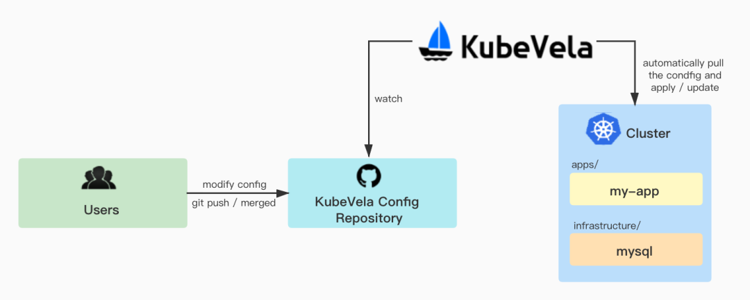 如下图所示,对于平台管理员/运维人员而言,他们并不需要关心应用的代码,所以只需要准备一个 Git 配置仓库并部署 KubeVela 配置文件,后续对于应用及基础设施的配置变动,便可通过直接更新 Git 配置仓库来完成,使得每一次配置变更可追踪。