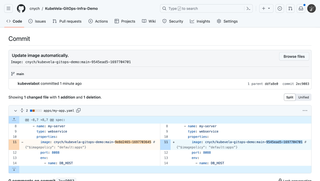 此时,可以看到配置仓库中有一条来自 kubevelabot 的提交,提交信息均带有 Update image automatically. 前缀。你也可以通过 {{range .Updated.Images}}{{println .}}{{end}} 在 commitMessage 字段中追加你所需要的信息。