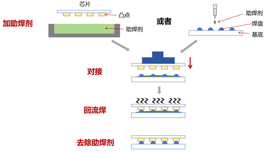 先将晶粒(芯片)的凸点沾上助焊剂,或者在基板上加定量的助焊剂。助焊剂的作用,是去除金属表面氧化物并促进焊料流动。