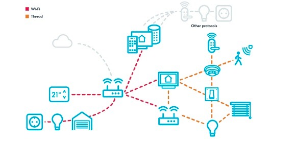 相比之下,Thread 是基于 IPv6 的网状网络协议,基于 IEEE 802.15.4 介质访问控制 (MAC)/物理层 (PHY)。它针对低带宽应用,并为智能插座或智能灯泡等简单设备带来良好的能效特性。Thread 是一种自我修复、低功耗的网状网络,可以适应添加到网络或从网络中删除的设备。它可以带来低延迟操作(因为设备可以直接相互通信,而无需中间集线器)、内置冗余以及延长的电池寿命。