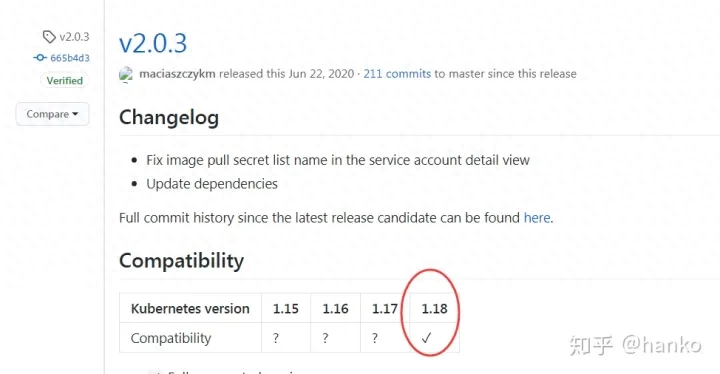 注意:选择版本时要注意,一定要下载与自己k8s的版本对应dashboard,不然web界面会报404。也就是要看看版本中的"Compatibility"