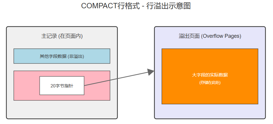 当数据过长时,它会把超出数据页容量的部分 “搬” 到额外的溢出页中存储;并在原数据页保留一个指向溢出页的指针(通常是20字节)。这就好比把装不下的书先放在旁边的临时箱子,再在原本的箱子贴上标签注明 “其余书在隔壁箱”。