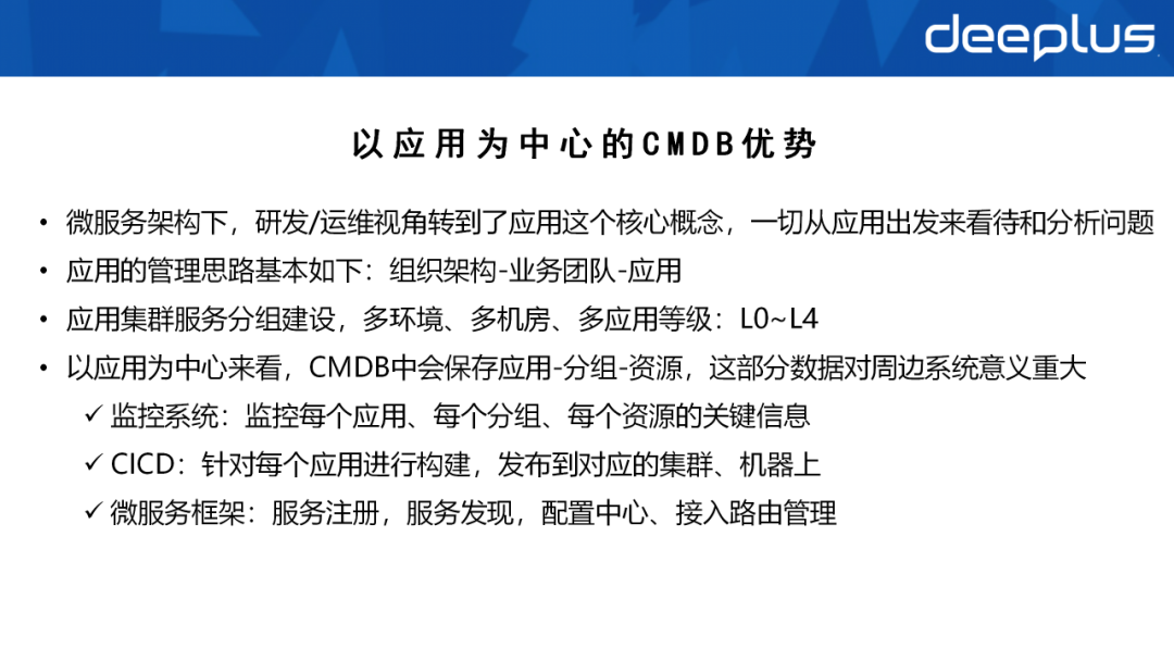 首先,确定应用属性。应用的属性可能包括,应用的中英文名称、应用等级、唯一ID、归属业务和业务域等,属性内容主要取决于个人定义。定义应用后,应用可能与其他CI产生关系,需进一步梳理。