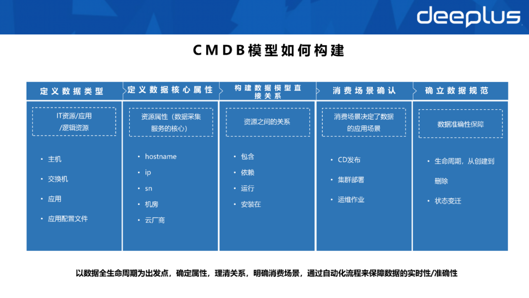 逐步实现配置自动发现、自动维护;实时跟踪资源的状态及配置变化;模型灵活,能够根据业务需求实时扩展和调整;配置可视化,能够支持资源问题的分析和快速定位。5)打造数据全生命周期闭环