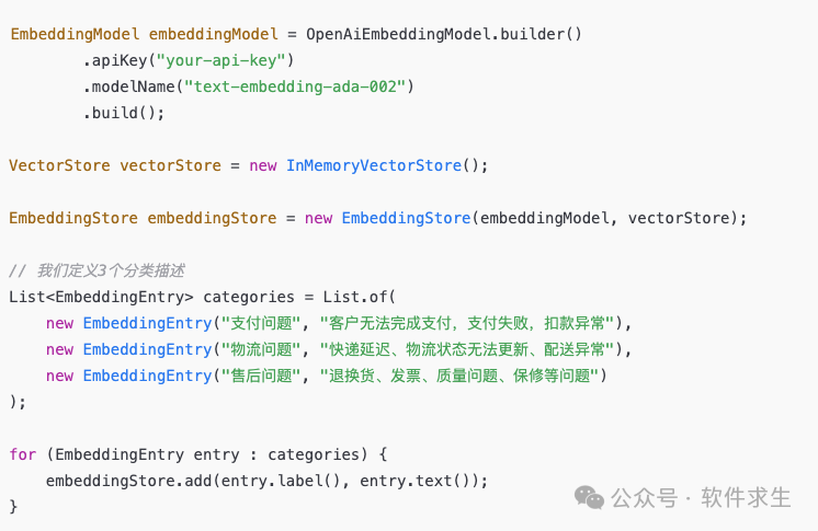我们把分类定义为 label+说明,并通过 embeddingStore 向量化后存进去。
