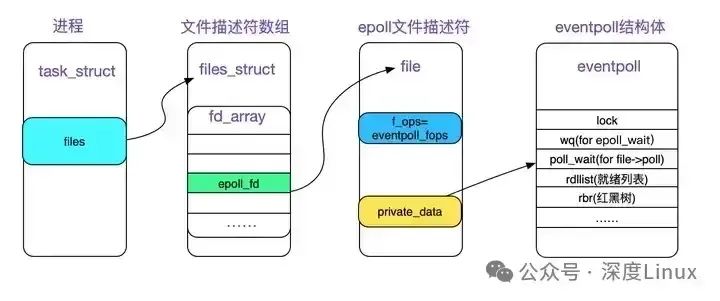 本文讲述的是 kernel 是如何将就绪事件传递给 epoll 并唤醒对应进程上,因此在这里主要聚焦于 (wait_queue_head_t wq) 等成员。