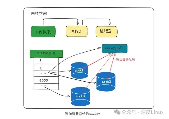 (4)维护监视列表创建epoll对象后,可以用epoll_ctl添加或删除所要监听的socket。以添加socket为例,如下图,如果通过epoll_ctl添加sock1、sock2和sock3的监视,内核会将eventpoll添加到这三个socket的等待队列中。