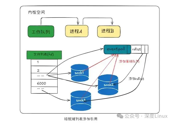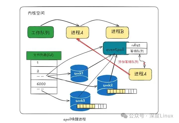 当socket接收到数据,中断程序一方面修改rdlist,另一方面唤醒eventpoll等待队列中的进程,进程A再次进入运行状态(如下图)。也因为rdlist的存在,进程A可以知道哪些socket发生了变化。