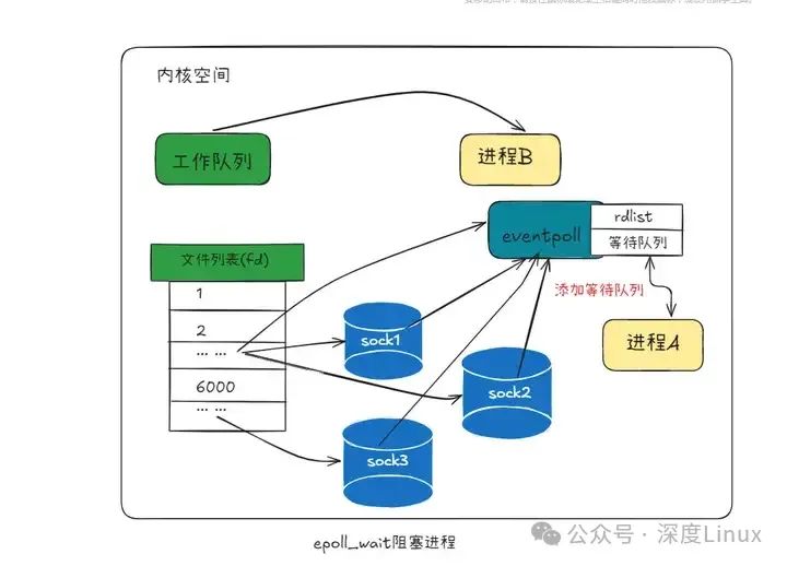(6)阻塞和唤醒进程假设计算机中正在运行进程A和进程B,在某时刻进程A运行到了epoll_wait语句。如下图所示,内核会将进程A放入eventpoll的等待队列中,阻塞进程。