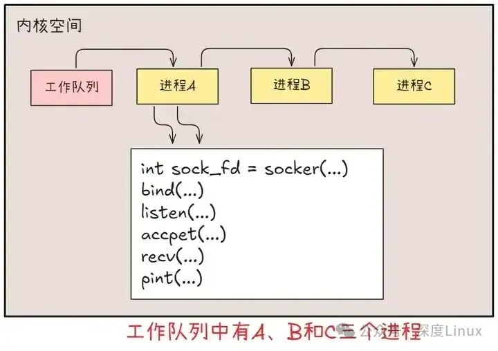 下图中的计算机中运行着A、B、C三个进程,其中进程A执行着上述基础网络程序,一开始,这3个进程都被操作系统的工作队列所引用,处于运行状态,会分时执行:
