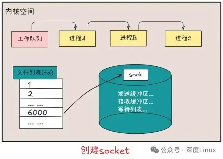 当进程A执行到创建socket的语句时,操作系统会创建一个由文件系统管理的socket对象(如下图)。这个socket对象包含了发送缓冲区、接收缓冲区、等待队列等成员。等待队列是个非常重要的结构,它指向所有需要等待该socket事件的进程。