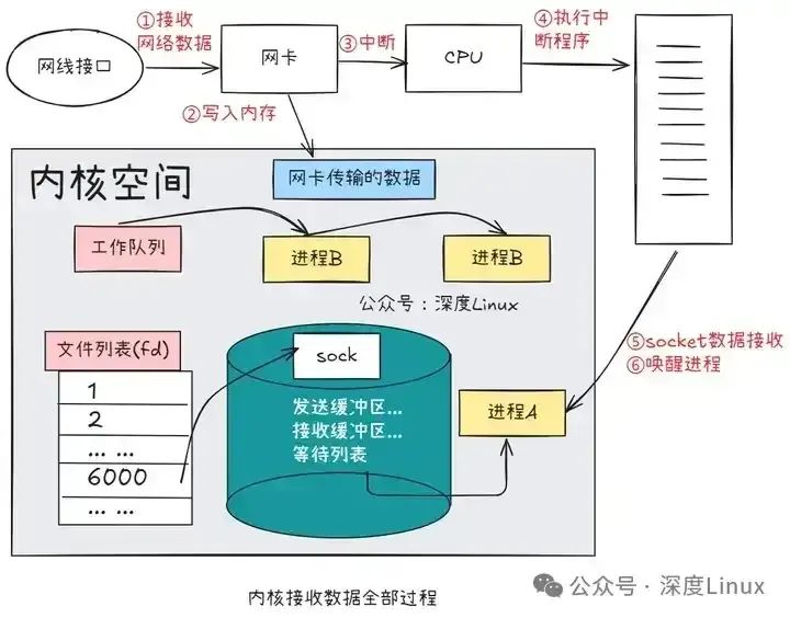 如下图所示,进程在recv阻塞期间,计算机收到了对端传送的数据(步骤①)。数据经由网卡传送到内存(步骤②),然后网卡通过中断信号通知CPU有数据到达,CPU执行中断程序(步骤③)。此处的中断程序主要有两项功能,先将网络数据写入到对应socket的接收缓冲区里面(步骤④),再唤醒进程A(步骤⑤),重新将进程A放入工作队列中。