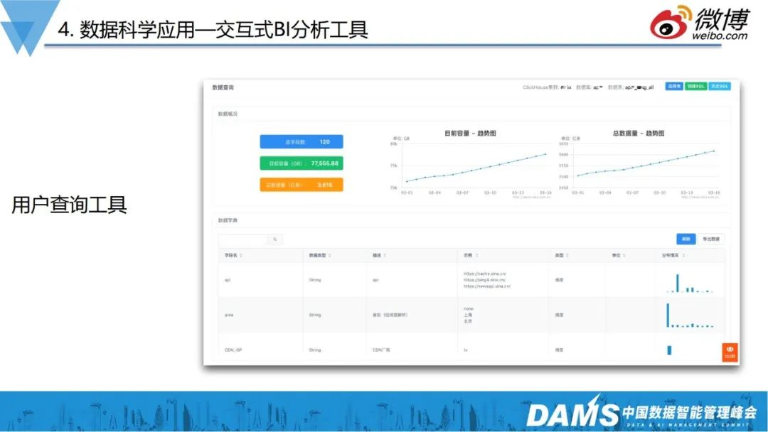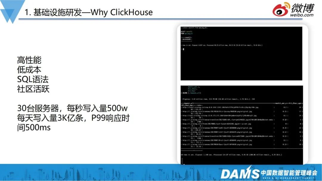 左图是新浪微博线上的一些数据表,基本上都是百亿、千亿级的规模,由于ClickHouse速度快、性能好、资源占用率低的特点,一些复杂SQL都可以在极短时间内返回我们想的结果。目前为止,ClickHouse每天承载的数据量大概在3,000亿条,每秒的数据量大概在500万左右。
