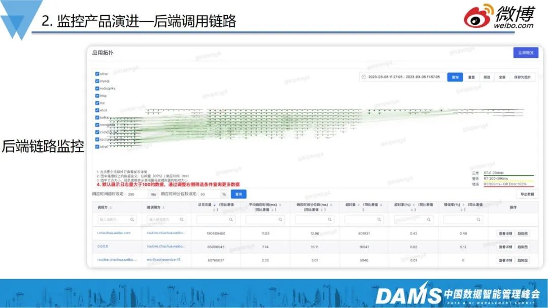 采样规则的开关是可以随时去调的,比如某段时间需要增加采集量,就可以随时把开关调大。其次在采访的时候,错误日志是全量上报的,这样也能保障数据的客观性。后端链路监控也是类似的规则,业务量较小是,基本上是全量采集。