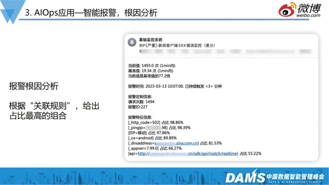 举个例子,上图是一个web服务5xx的报警,传统运维可能会配置500、502、504多个报警,无疑会增加工作量。现在我们支持配置一个5xx的报警,让报警告诉你现在是谁占得多?哪个运营商的用户受影响最大?具体是哪个接口?有了这些信息,就可以帮助运维减少大量的排查工作。