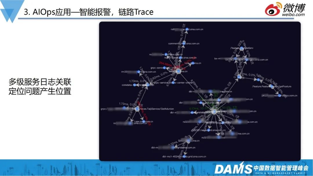 在AIOps应用上,我们还做了多级服务日志关联,定位问题产品位置。如图是端上发生的一次链路,我们展示了它在后端整个调用链路,在这个过程中,它对哪些资源依赖、对各个链路上是否有问题,我们都可以很直观看到。
