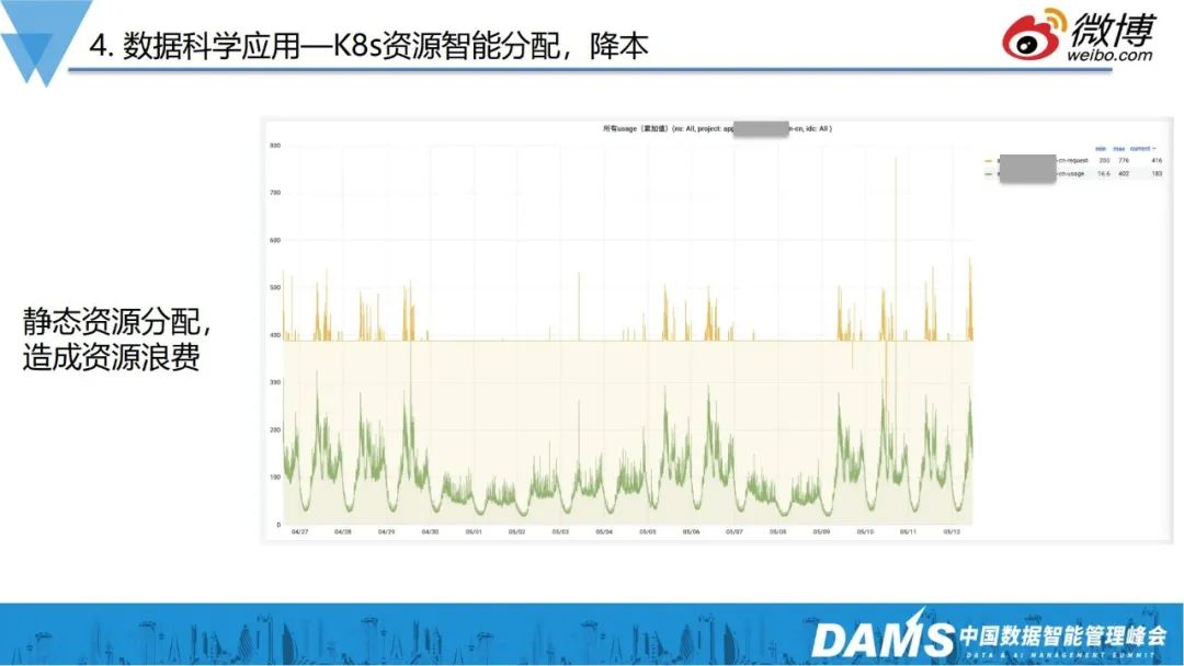 我们用一些简单的数据分析,就把问题解决了。如上图所示是财经类的业务,周六日不开盘,量非常少,工作日9-11点、14-16点开盘,黄色曲线是K8s request给某个项目两周时间全部CPU,绿色是实际CPU的使用情况,可以看到有明显的大周期和小周期,如果把黄线拉得过高,大部分业务空闲的时候,资源就会白白浪费。