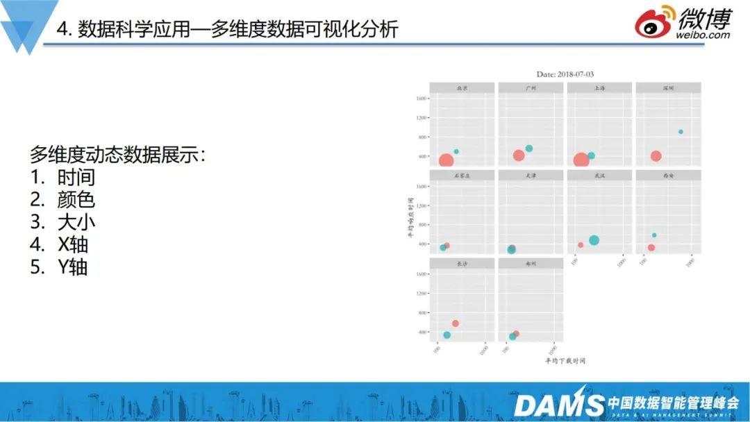 如上图所示,我们在数据分析上,也对CDN服务做了多维度的数据展示。图中是一个多家CDN性能的综合对比,展示了五个维度的动态数据,其中包括日期数据,颜色代表厂家,圆圈大小代表体量,X轴和Y轴分别代表了CDN的响应时间和下载时间。