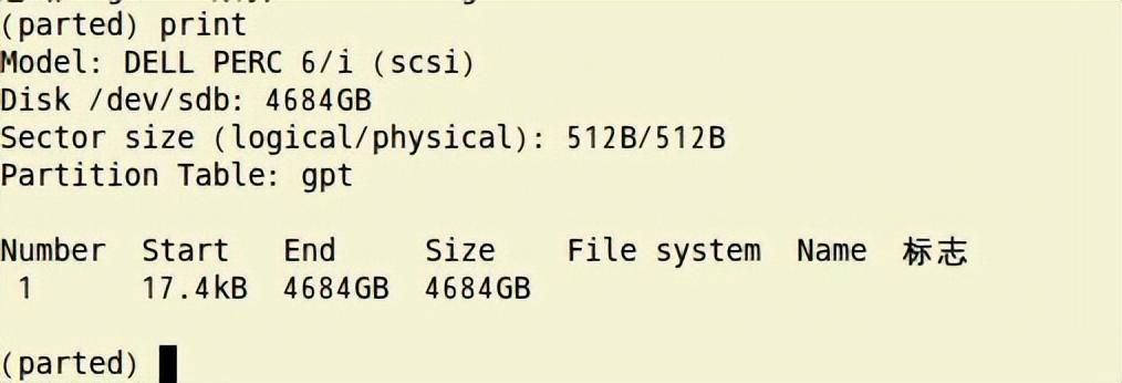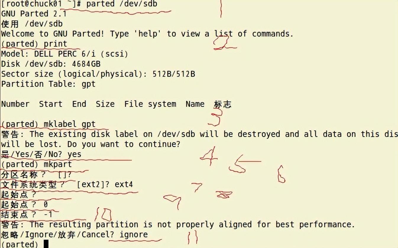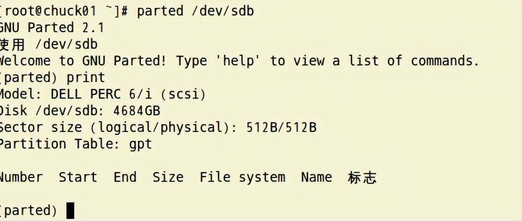 2、 现在使用parted 命令对/dev/sdb 4.6TB进行分区,具体如下图所示。