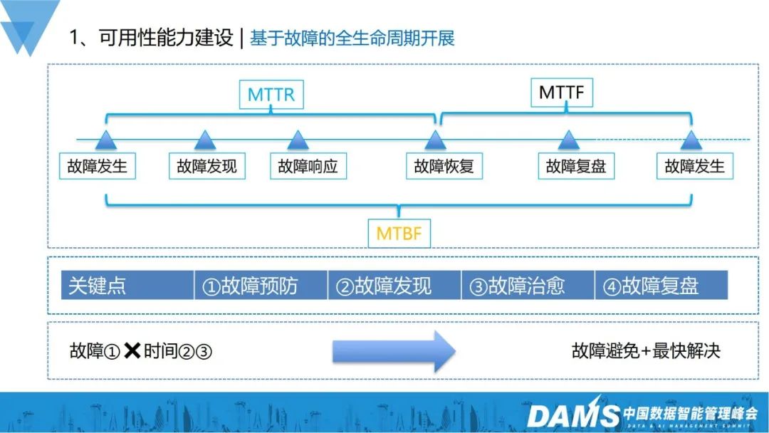 1、基于故障的全生命周期开展我们的可用性的能力建设是基于故障的全生命周期去开展的,从故障发生、发现、响应、恢复、复盘到再次发生。从故障发生到恢复的时间,称为MTTR;从故障的恢复到发生,从稳定到不稳定,称为MTTF;故障发生的间隔时间,称为MTBF,总计3个指标。