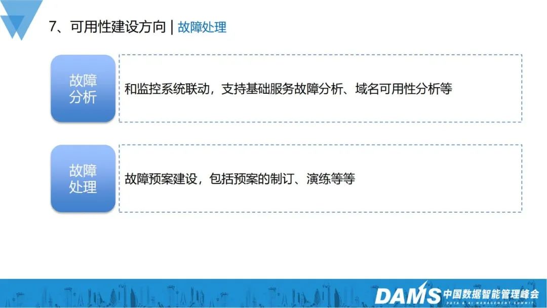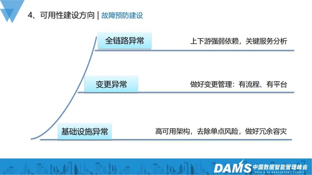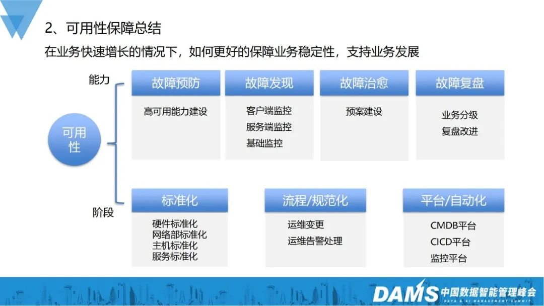 可用性能力建设:故障预防、故障发现、故障治愈、故障复盘可用性阶段建设:标准化、流程/规范化、平台/自动化未来,我们会重点关注异地多活、容器/云原生的可用性保障。