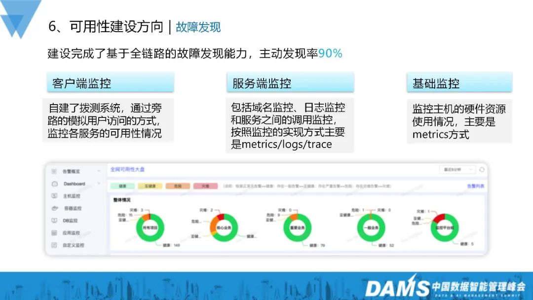 5、故障发现我们建设了基于全链路的故障发现能力,目到故障主动发现率能达到90%,这当中包括客户端监控、服务端监控和基础监控: