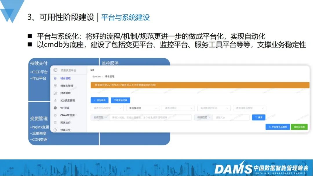 3、平台与系统建设在平台与系统建设上,以CMDB为底座,把往常较好的流程机制更进一步做成平台,如变更平台、监控平台、服务工具平台等,以此支撑业务稳定性。
