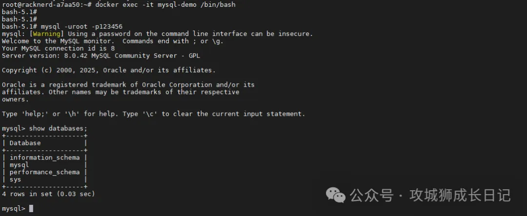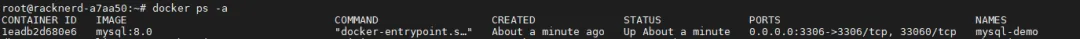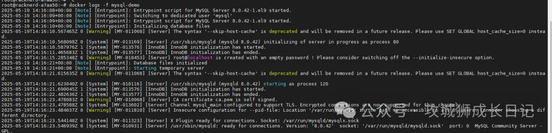 输出中看到 mysql-demo 正在运行说明成功啦!如下图所示:
