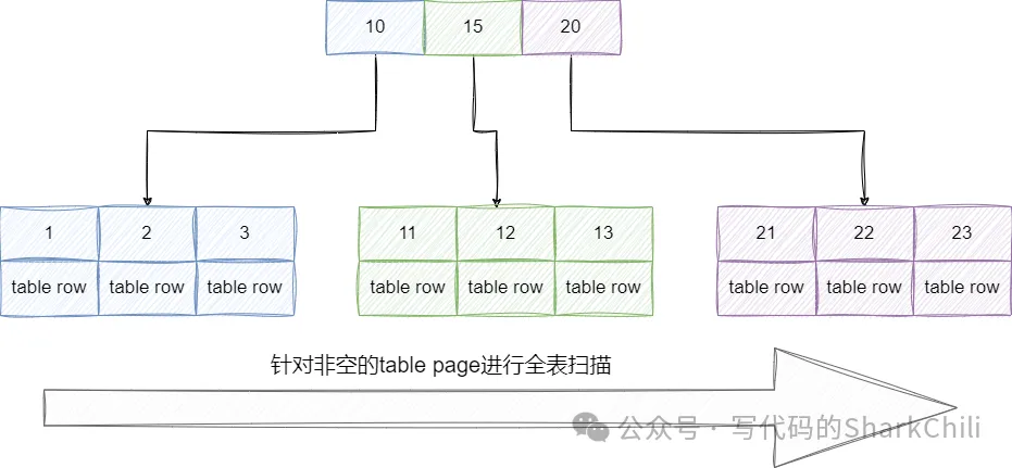 因为查询时没有使用任何索引,所以查询时直接进行完整的table scan即针对整颗聚簇索引树的非空data域进行扫描检索: