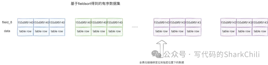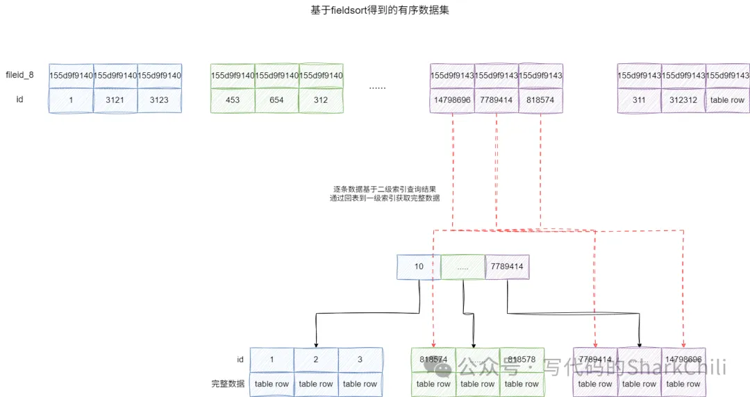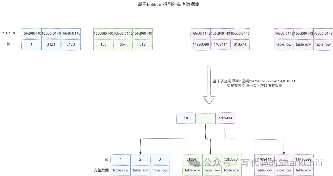 因为我们基于fileid_8创建了二级索引,所以我们可以借助MySQL中索引覆盖的特性,在排序时通过扫描二级索引定位到主键索引区间,并基于这个主键区间一次性到聚簇索引树上获取所有数据,避免多次回表的开销。