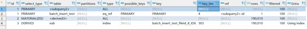 子查询直接Using index直接拿到主键,虽然评估扫描大约是190010,但是避免了回表,性能较为可观。主表batch_insert_test通过聚簇索引id和被驱动表t1直接关联,快速得到数据。