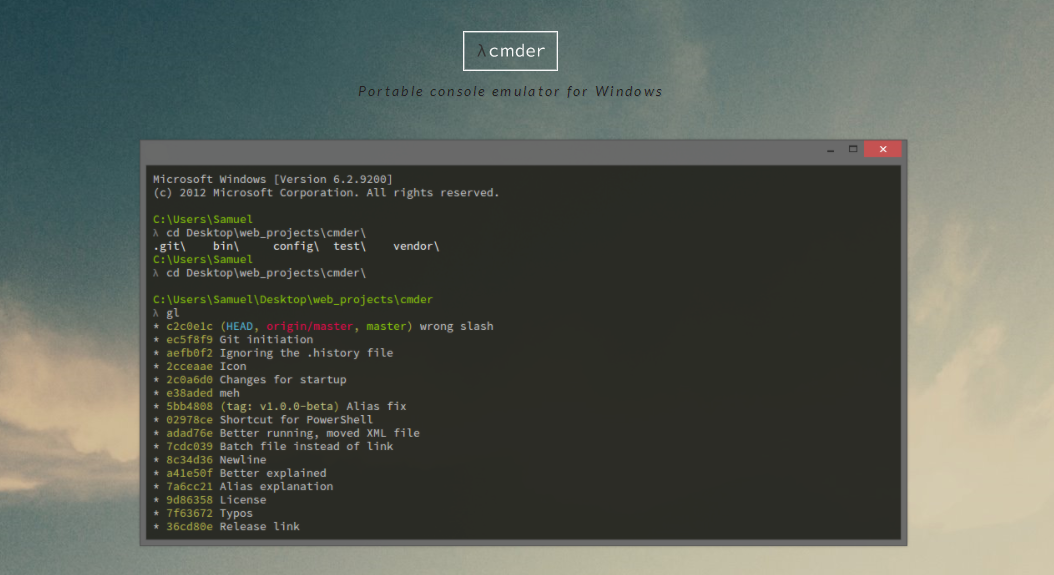 2、CmderCmder是一款Windows环境下非常简洁美观易用的cmd替代者,它属于一个跨平台的命令行增强工具,可以集成windows batch, power shell, git, linux bash等多种命令行于一体,支持了大部分的Linux命令,比如 grep, curl(没有 wget),vim,grep,tar,unzip,ssh,ls,bash,perl等。