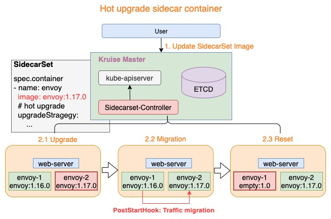 SidecarSet 支持通过 admission webhook 来自动为集群中创建的符合条件的 Pod 注入 sidecar 容器,除了在 Pod 创建时候注入外,SidecarSet 还提供了为 Pod 原地升级其中已经注入的 sidecar 容器镜像的能力。SidecarSet 将 sidecar 容器的定义和生命周期与业务容器解耦,它主要用于管理无状态的 sidecar 容器,比如监控、日志等 agent。