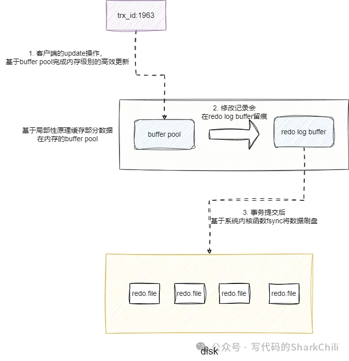 例如当我们需要对数据修改(update)操作时,基于buffer pool完成高效的数据更新操作后将事务提交,此时我们的redo日志数据就会按照innodb_flush_log_at_trx_commit指定的刷盘机制叫redolog缓存数据刷盘: