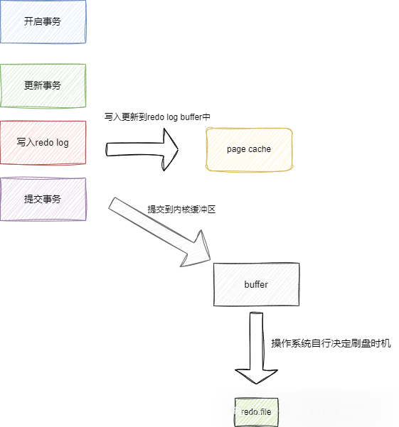 页是操作系统的基本单位,一页差不多16kb,而我们每次操作的数据可能也就x byte,为了x byte的数据操作将一页的数据进行同步持久化实在有些大材小用了,所以通过redo log buffer记录修改内容,通过刷盘策略进行数据刷盘更新,由此提升数据库的并发能力: