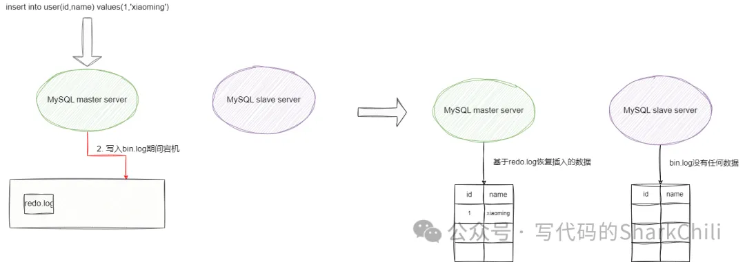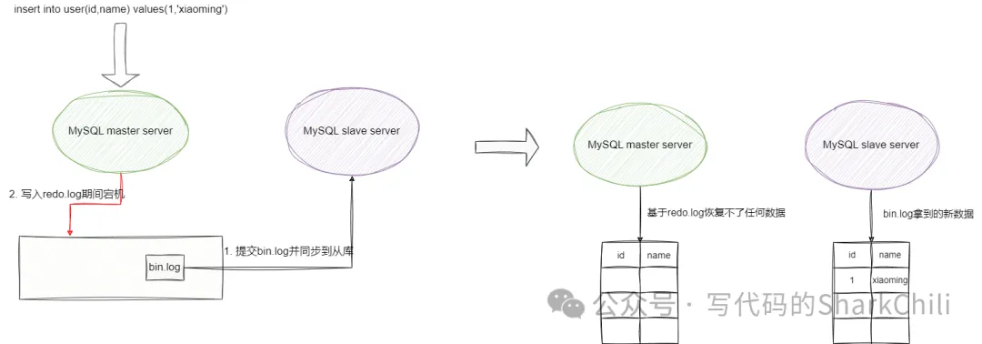 数据库重启恢复,然后主库发现bin.log有个commit成功的数据(事务是完整的)然redo.log处于prepare阶段,但是我们还是可以根据情况推断出有个当前主库有个commit成功的事务,所以redo.log会根据bin.log将redo.log设置为commit从库已根据主库的bin.log发现有新增一条新数据,由此同步一条更新数据,双方都有了一条新数据,数据库一致性由此保证: